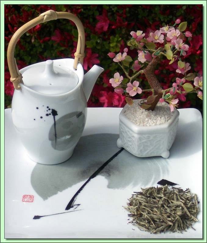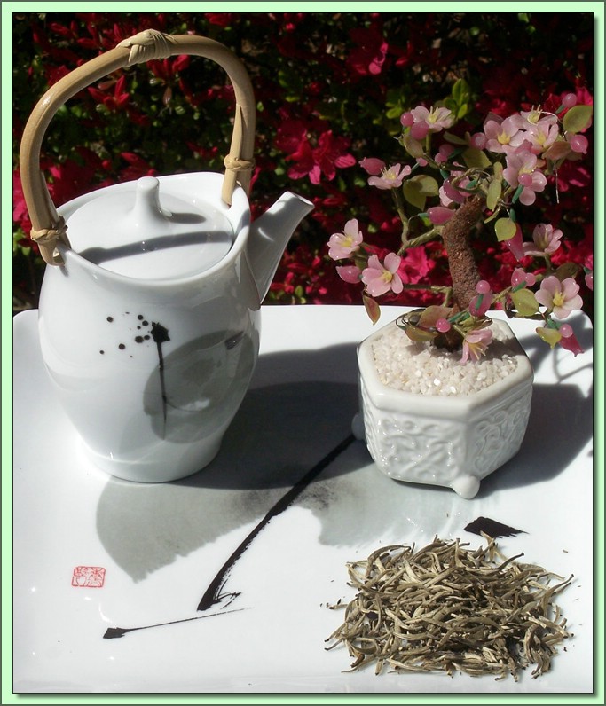 Processing: Naturally withered Peony White Needle Superior grade, (a.k.a. Yin Zhen Bai Hao). There are two intact grayish white leaves that surround a silver bud covered with a silvery white down. The processing rules require this tea only be picked between March 15 and April 10. It is not picked on days that may be raining or if the dew has not dried or if there is frost on the ground. No purple buds are allowed and the stems must not be too long or too short. Leaves damaged by wind, handling, insects or partially open are rejected and put into a lower grade.